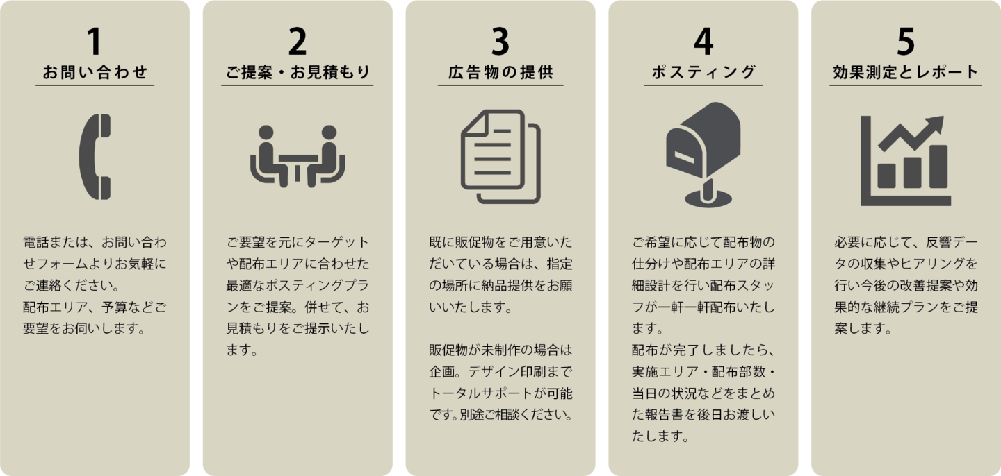 地域のご家庭や事業所へ手配りで確実にお届けする「ポスティング」サービスを主軸に、